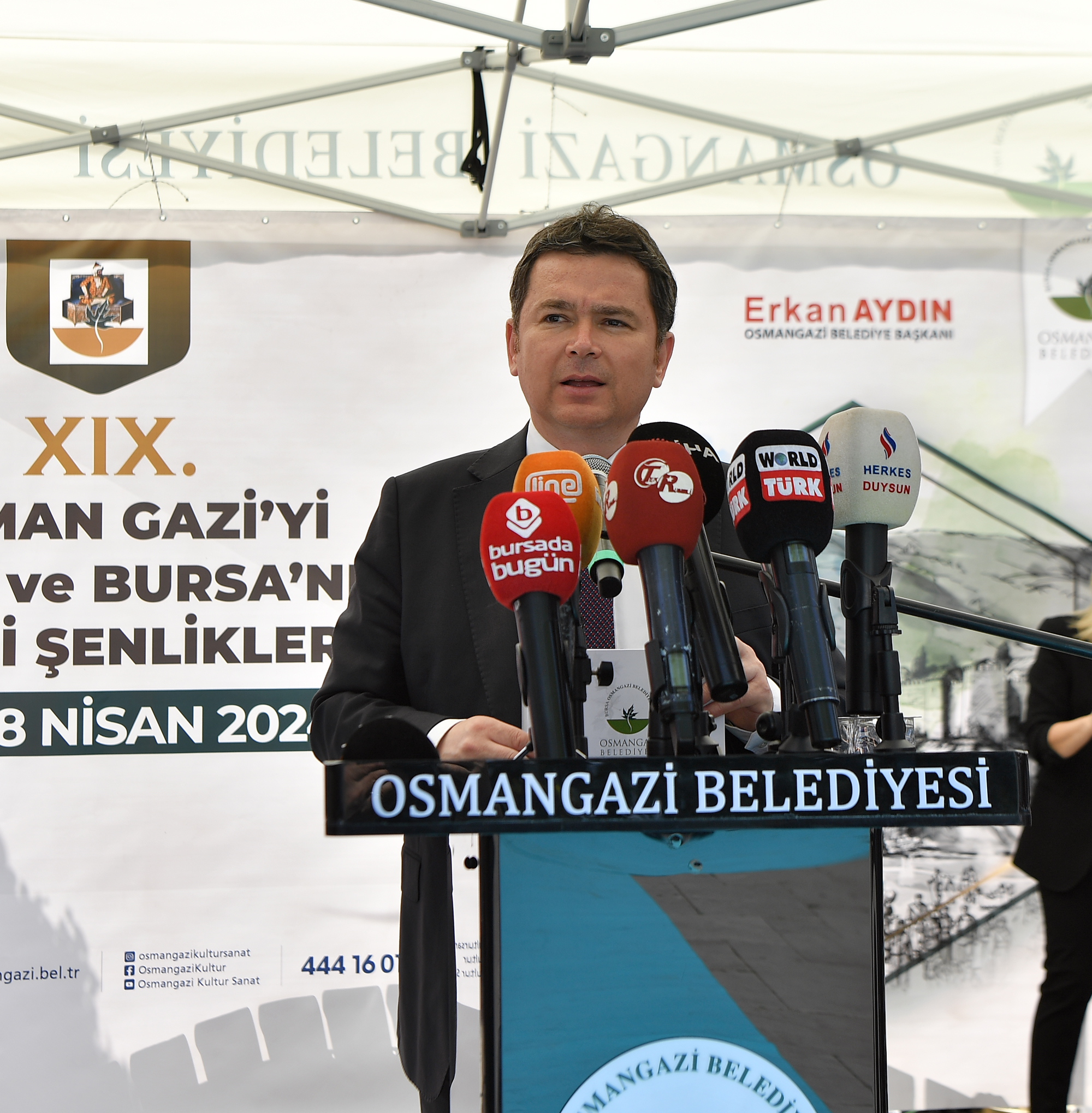 Açılış töreninde konuşan Osmangazi Belediye Başkanı Erkan Aydın, “Osmangazi Belediyesi olarak bu yıl 19’uncusunu gerçekleştirdiğimiz “Osman Gazi’yi Anma ve Bursa’nın Fethi Şenlikleri’ni geçtiğimiz yıllarda olduğu gibi yine büyük bir coşku ve adına yaraşır şenlik havasında kutlamaya devam ediyoruz. Bursa’nın fethini canlandırmak, fetih coşkusunu yüzyıllar sonra yeniden yaşatmak, tarihimizi, kültürümüzü ve geleneklerimizi canlı tutmak amacı ile düzenlediğimiz şenliklerde, birçok etkinliği hemşehrilerimizle buluşturuyoruz. Nisan ayı boyunca şehrimizde adeta bir bayram havası yaşatan etkinliklerle; Bursa’nın kuruluş felsefesini bilimsel toplantılarda, sportif faaliyetlerde ve yaşam kültüründe sergiliyor, yaşatıyoruz. Yörükleri, Türkmenleri, yerli ve yabancı birçok kişiyi bir araya getiren, Türk geleneklerini şölene dönüştüren Fetih Şenlikleri ve yürüyüşü ile tarihimize, kültürümüze ve geleneklerimize yolculuk ediyor, geçmişi geleceğe taşıyoruz. Bizler fetih yürüyüşü ile tüm dünyaya birliğin, beraberliğin, barışın ve hoşgörünün mesajını veriyoruz” dedi.