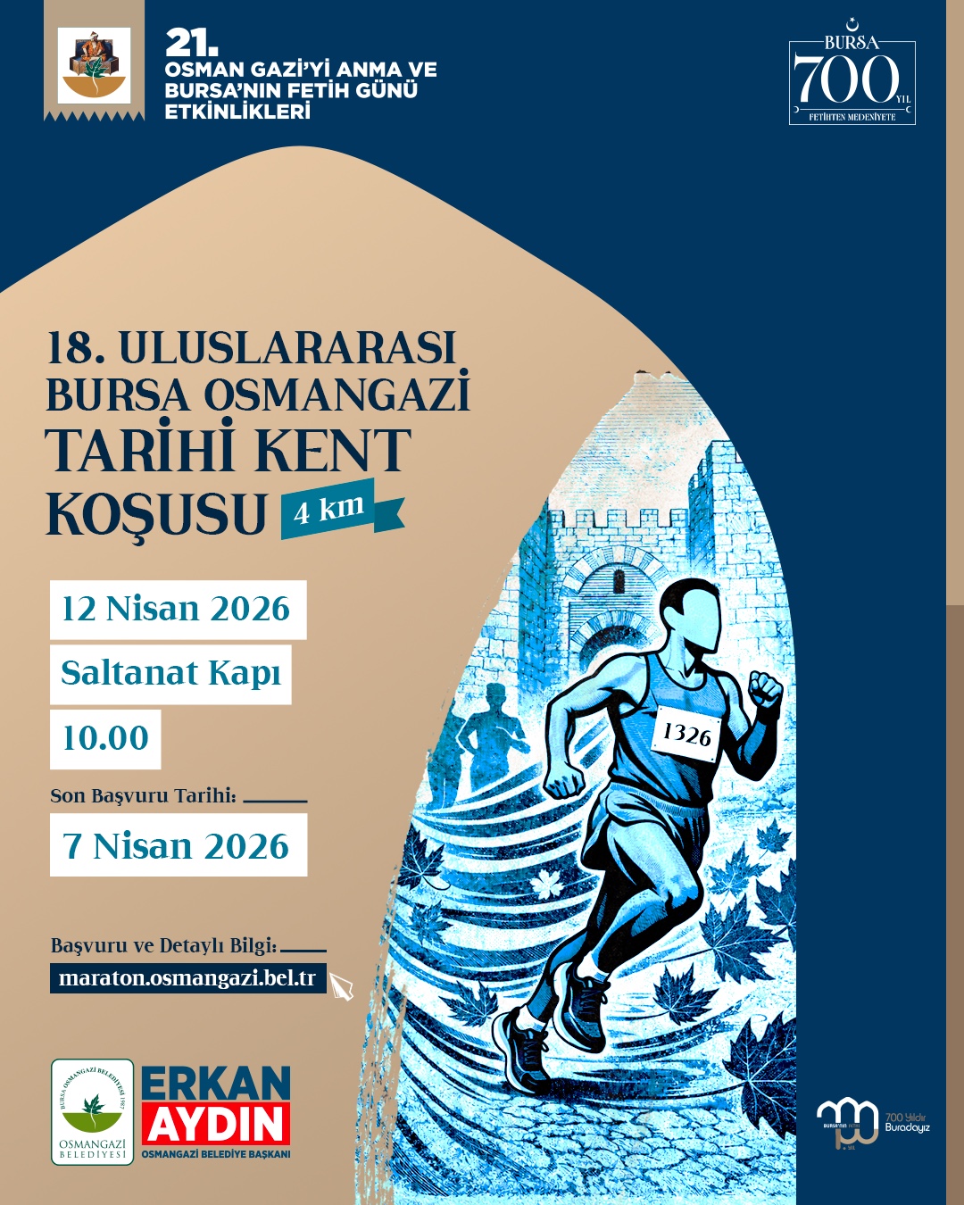 Osmangazi Belediyesi’nin bu yıl 21’incisini düzenlediği “Osman Gazi’yi Anma ve Bursa’nın Fethi Etkinlikleri” kapsamında gerçekleşecek 18. Uluslararası Bursa Osmangazi Tarihi Kent Koşusu, Bursa’nın Fethi’nin 700. Yıl Dönümü ile ayrı bir anlam kazanacak. 4 kilometrelik parkurda gerçekleşecek koşu, Bursa’nın geçmişten günümüze uzanan mirasını sporla bir araya getirecek.
