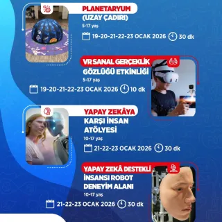 Bilim Şenliği’ne katılan çocuklar ve gençler; sanal gerçeklik uygulamalarından robotik kodlama atölyelerine, çeşitli yarışmalardan atölye çalışmalarına kadar birçok etkinliğe katılarak teknoloji dolu bir gün geçirme fırsatı bulacak. Etkinlik kapsamında robotik kodlama uygulamaları, astronomi, uzay temalı çalışmalar, kağıt sanatları, akıl ve zeka oyunları ile bilimsel içerikli birçok atölye yer alacak. Katılımcılar, hem eğlenerek öğrenme imkanı yakalayacak, hem de bilim ve teknolojiye olan ilgilerini geliştirecek. Sanal gerçeklik deneyimleri ve robotik kodlama etkinlikleri sayesinde çocuklar ve gençler, geleceğin teknolojilerini yakından tanıma şansı elde edecek.