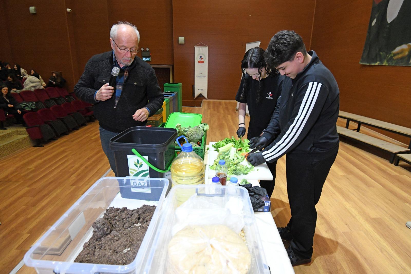 Şehit Erol Olçok Mesleki ve Teknik Anadolu Lisesi’nde düzenlenen seminere; Osmangazi Belediyesi Gazi Tarım Genel Müdürü Arca Atay, Osmangazi Belediyesi İklim Değişikliği ve Sıfır Atık Müdürü Rüveyşa Burça Sütcüoğlu, belediye meclis üyeleri ile çok sayıda öğrenci katılım gösterdi. Programda konuşan Rüveyşa Burça Sütcüoğlu, doğal kaynakların sınırlı olduğuna dikkat çekerek artan nüfusla birlikte atık miktarının da hızla yükseldiğini belirtti. Bunun yanı sıra seminer kapsamında Sütcüoğlu; atıkların kaynağında ayrıştırılmasının çevreye katkıları, gıda israfının önlenmesinin ekonomik ve ekolojik önemi ile sürdürülebilir tüketim alışkanlıklarının günlük yaşama nasıl entegre edilebileceği konularında öğrencilere detaylı bilgiler verdi.