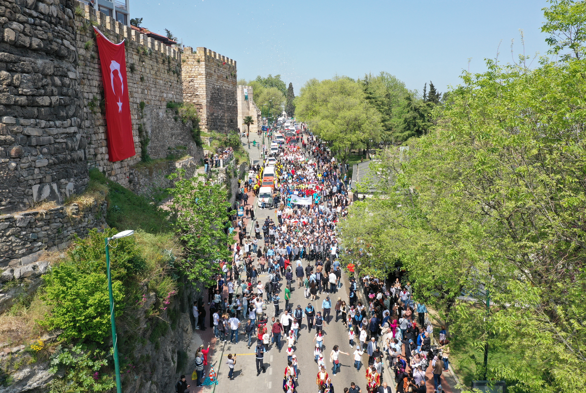 Konuşmaların ardından şenliklerin en önemli ayağını oluşturan Fetih Yürüyüşü, halkın geniş katılımıyla Saltanat Kapı’dan başladı. Atlı birlikler, kılıç kalkan ekibi, mehter takımı, yöresel derneklerin halk oyunları ekipleri, amatör spor kulüplerinin sporcuları, sivil toplum kuruluşları üyeleri, ahi gurupları ve çeşitli derneklerin temsilcilerinin yer aldığı dev kortej, konfetilerin patlamasıyla birlikte yürüyüşe geçti. Kortejin geçişi sırasında protokolü alkışlayan vatandaşlar da şenlik coşkusunu doyasıya yaşadı. Yol kenarına sıralanan binlerce Bursalı bu muhteşem görüntüyü ölümsüzleştirmek için adeta fotoğraf çekme yarışına girdi. Dev bir kortej eşliğinde gerçekleşen Fetih Yürüyüşü, Saltanat Kapı, Atatürk Caddesi, İnönü Caddesi ve Cumhuriyet Caddesi güzergahında devam ederek Panorama 1326 Bursa Fetih Müzesi önünde halk dansları ekiplerinin muhteşem gösterisiyle son buldu. Başkan Aydın da ekiplerin oyunlarına eşlik etti.