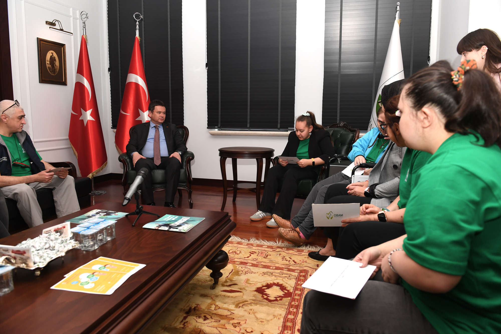 Osmangazi Belediye Başkanı Erkan Aydın, 10-16 Mayıs Dünya Engelliler Haftası kapsamında OBAM üyeleri Nihan Kardaşko, Fatih Diden, Melike Kırço, Eslem Mert, Kadriye Dokumacı ve Ertan Ataş’ı makamında ağırladı. OBAM sakinleri ile yakından ilgilenen ve ziyaret süresince neşelerine, enerjilerine ve mutluluklarına ortak olan Başkan Aydın, engelli bireylerin toplumsal hayata tam katılımı için yürütülen çalışmaların önemine vurgu yaptı.