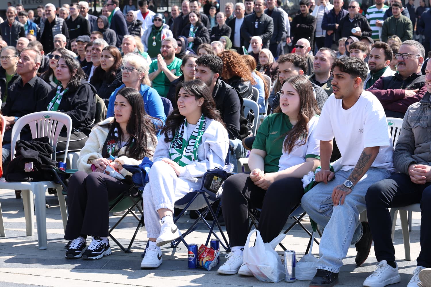 Osmangazi Belediyesi tarafından kurulan dev ekranda Bursaspor maçını izlemek isteyen taraftarlar, Osmangazi Meydanı’na akın etti. Yeşil-beyaz renklere gönül verenlerin yoğun ilgi gösterdiği organizasyonda meydan, karşılaşmanın başlama düdüğüyle birlikte büyük bir coşkuya sahne oldu. Osmangazili vatandaşlar, mücadeleyi ellerinde bayrak ve atkılarla büyük bir heyecanla takip etti.