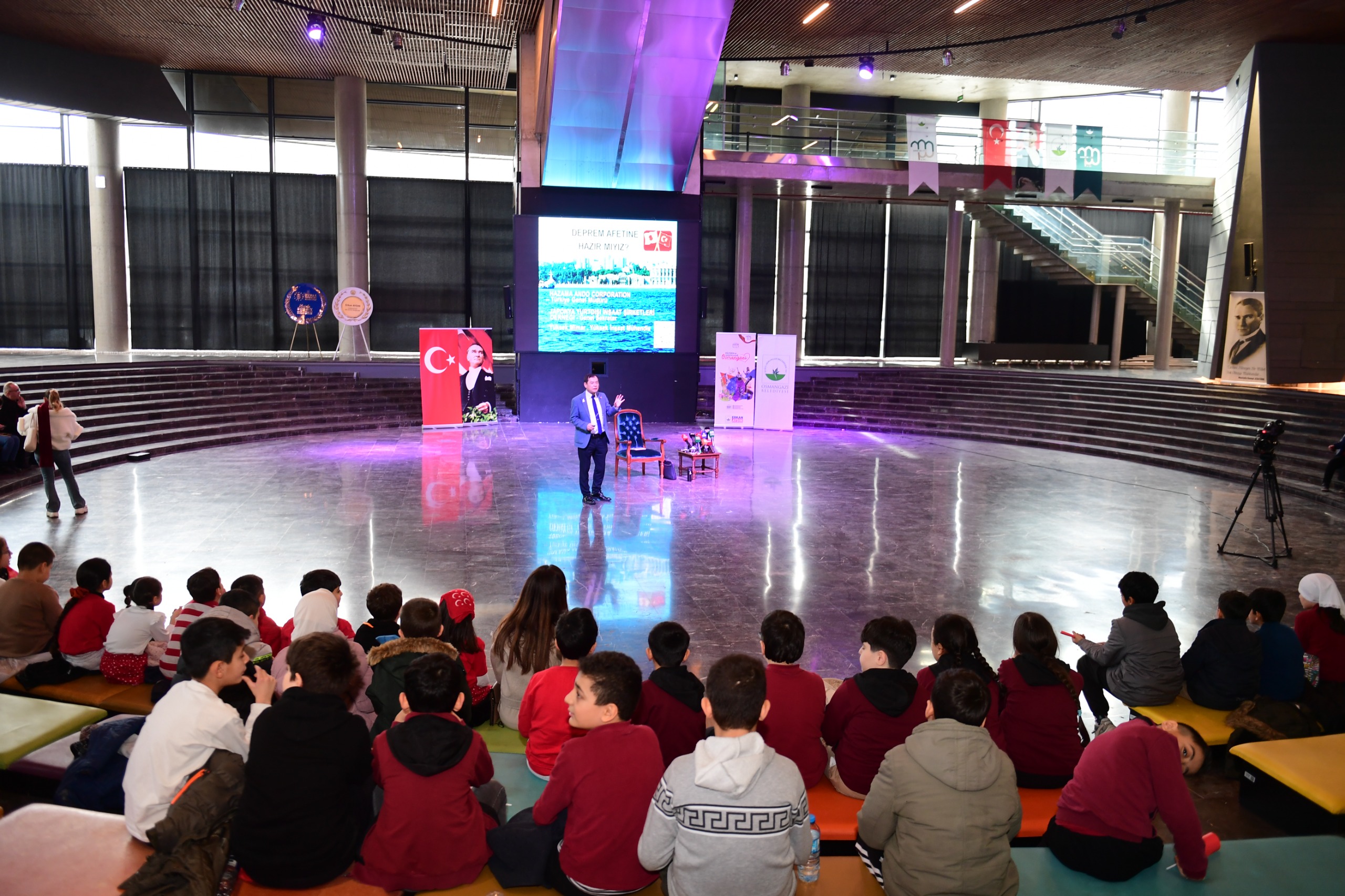 Deprem gerçeğine ilişkin farkındalığı artırarak, riskleri azaltmayı, toplumsal bilinci erken yaşta güçlendirmeyi hedefleyen Osmangazi Belediyesi, Deprem Uzmanı ve İnşaat Mühendisi Yoshinori Moriwaki’nin katılımıyla çocuklara yönelik geniş kapsamlı bir söyleşi gerçekleştirdi. Deprem öncesinde, sırasında ve sonrasında yapılması gerekenleri aktaran Moriwaki, depreme her an hazırlıklı olunması gerektiğini kaydetti.